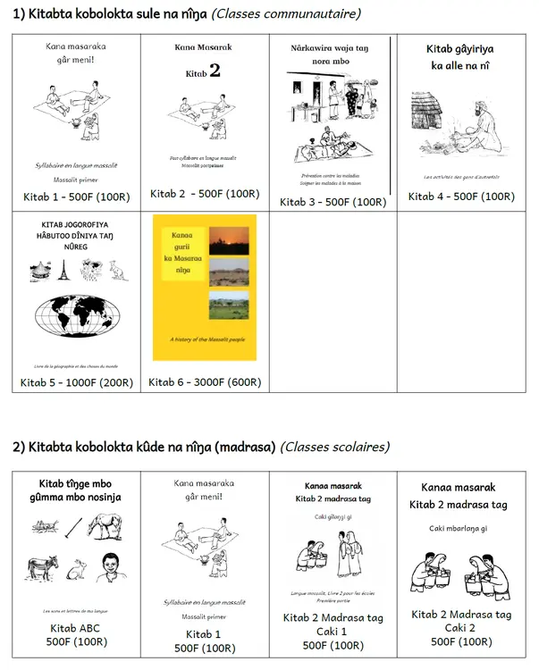 ولنا كتابين هما قواميس مترجمة باربع لغات لغة المساليت ولغة العربية والفرنسية والانجليزية :
